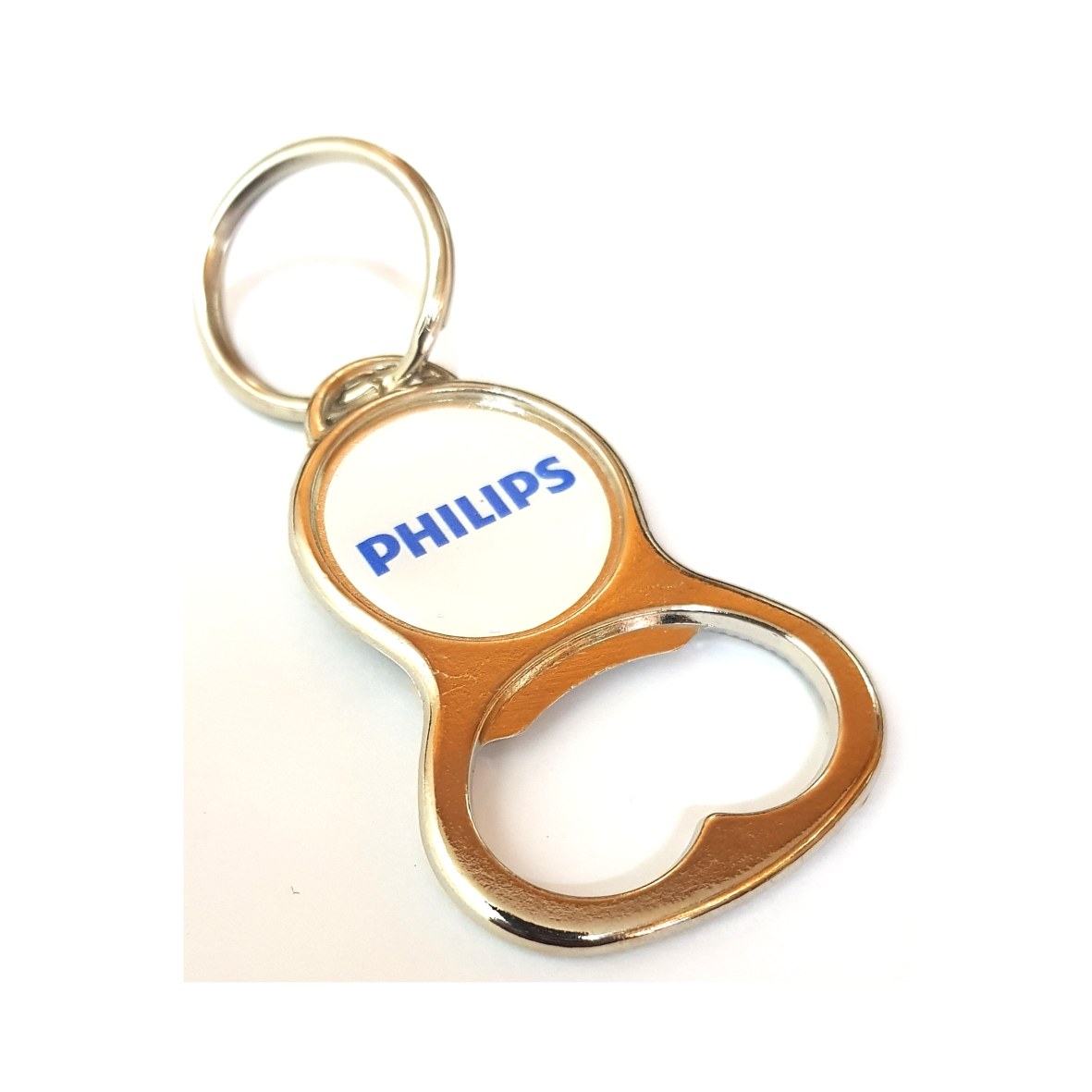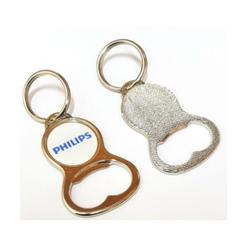 Llavero destapador metálico, de buen espesor (súper resistente), plateado con logo full color simple faz.