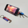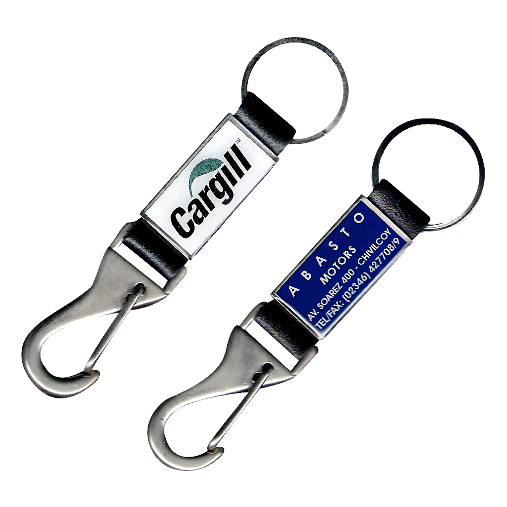 Llavero de bronce con tira de cuero, sinfin plano y mosquetón.