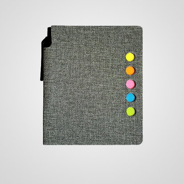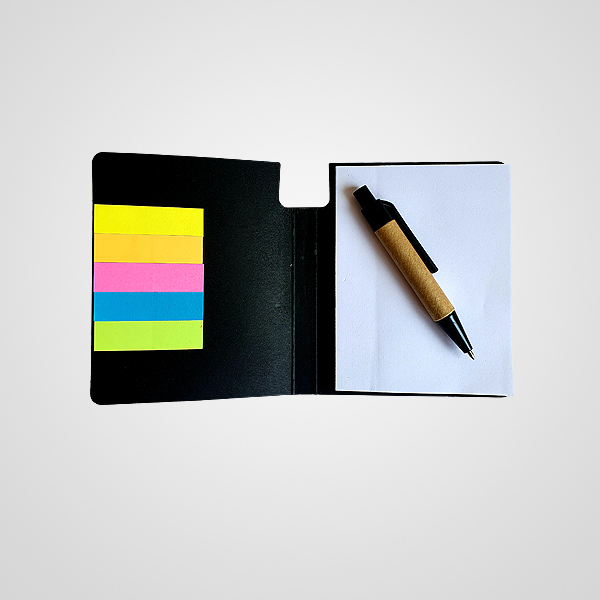 Libreta de cartón con bolígrafo inserto, block blanco adhesivo de 50 hojas y señaladores adhesivos.