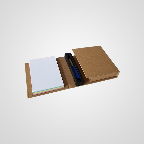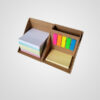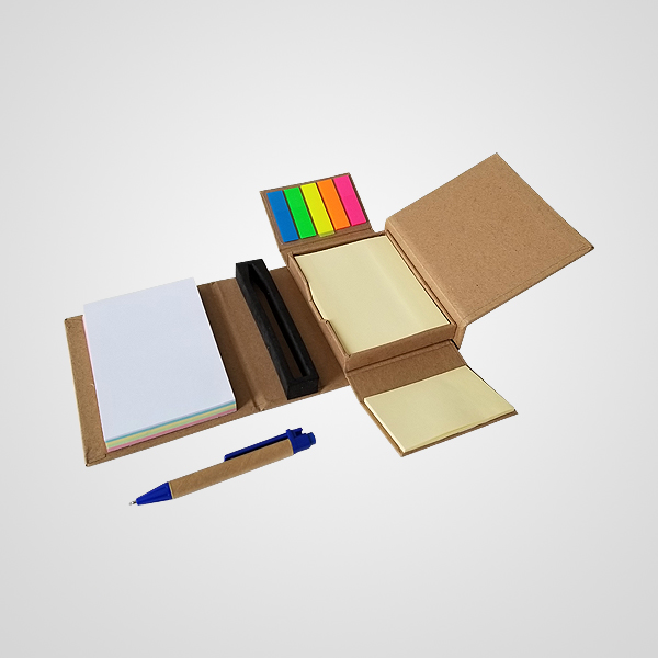 Contiene taco adhesivo central, taco adhesivo lateral (menor tamaño), señaladores adhesivos y taco tipo libreta lateral, también el bolígrafo en su contenedor.
