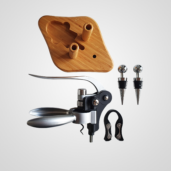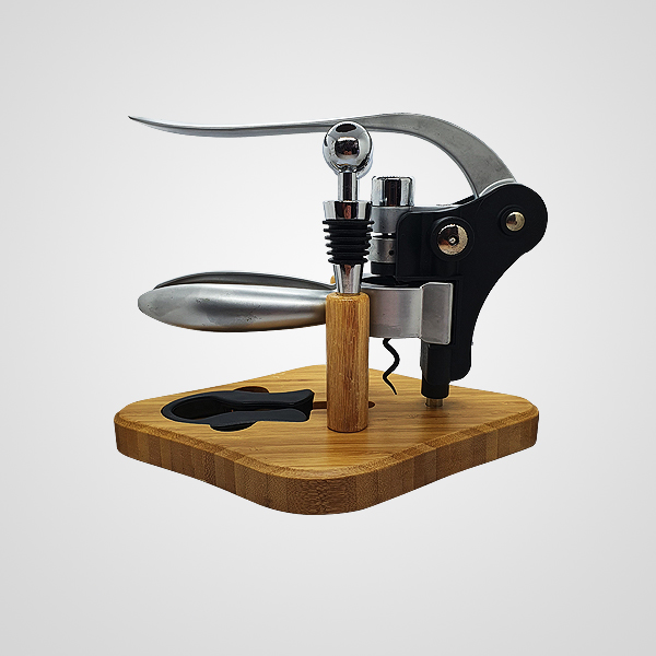 Destapador palanca con 2 tapones metálicos y corta capsultas sobre base de madera.